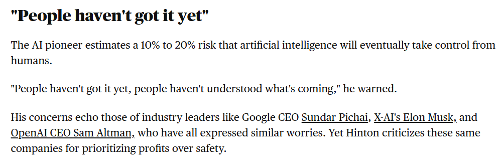 CBS Saturday Morning "Godfather of AI" Geoffrey Hinton warns AI could take control from humans: "People haven't understood what's coming"