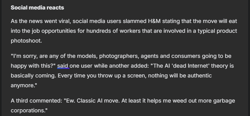 sooo H&M will begin using AI digital twins for their models, naturally to the dismay of a lot of people